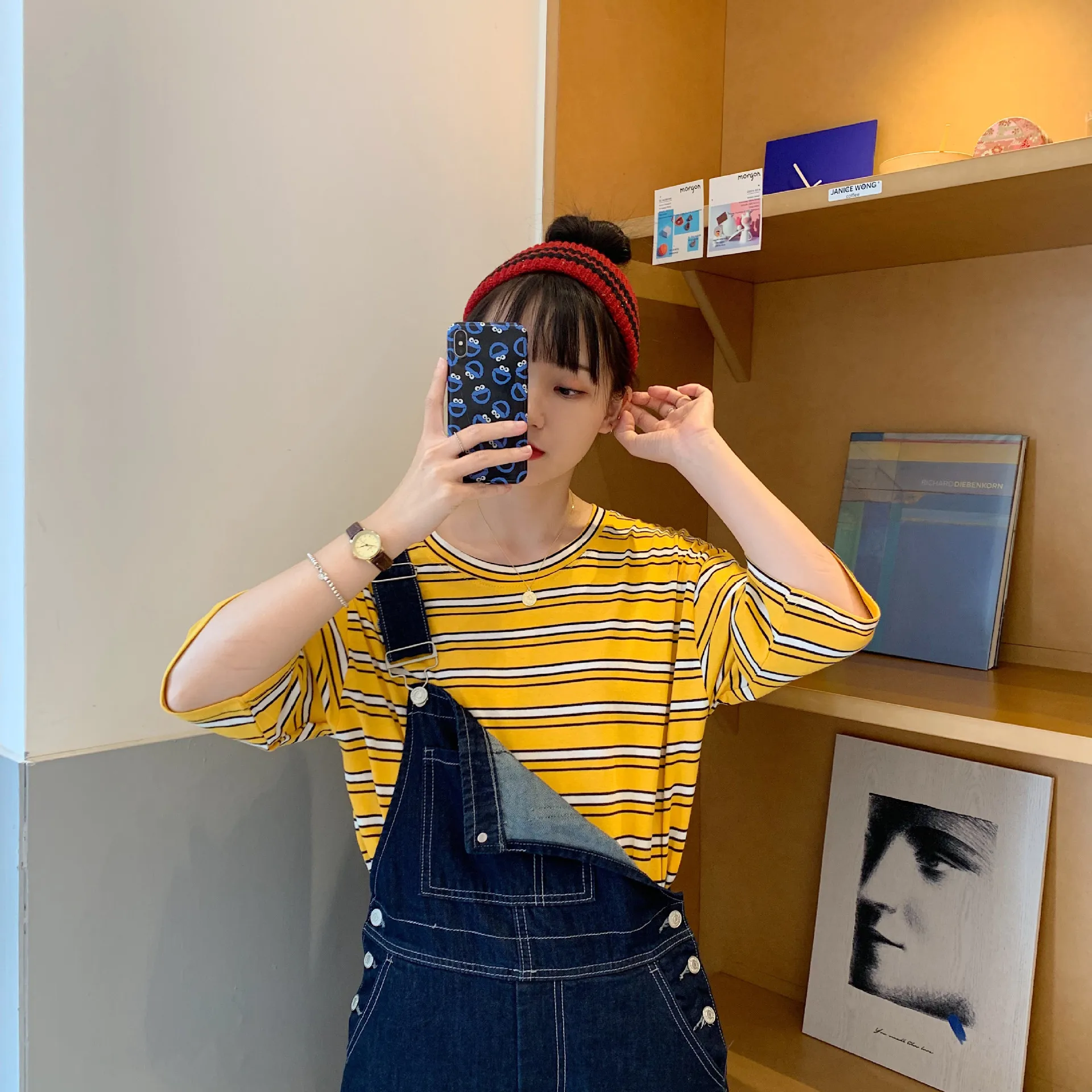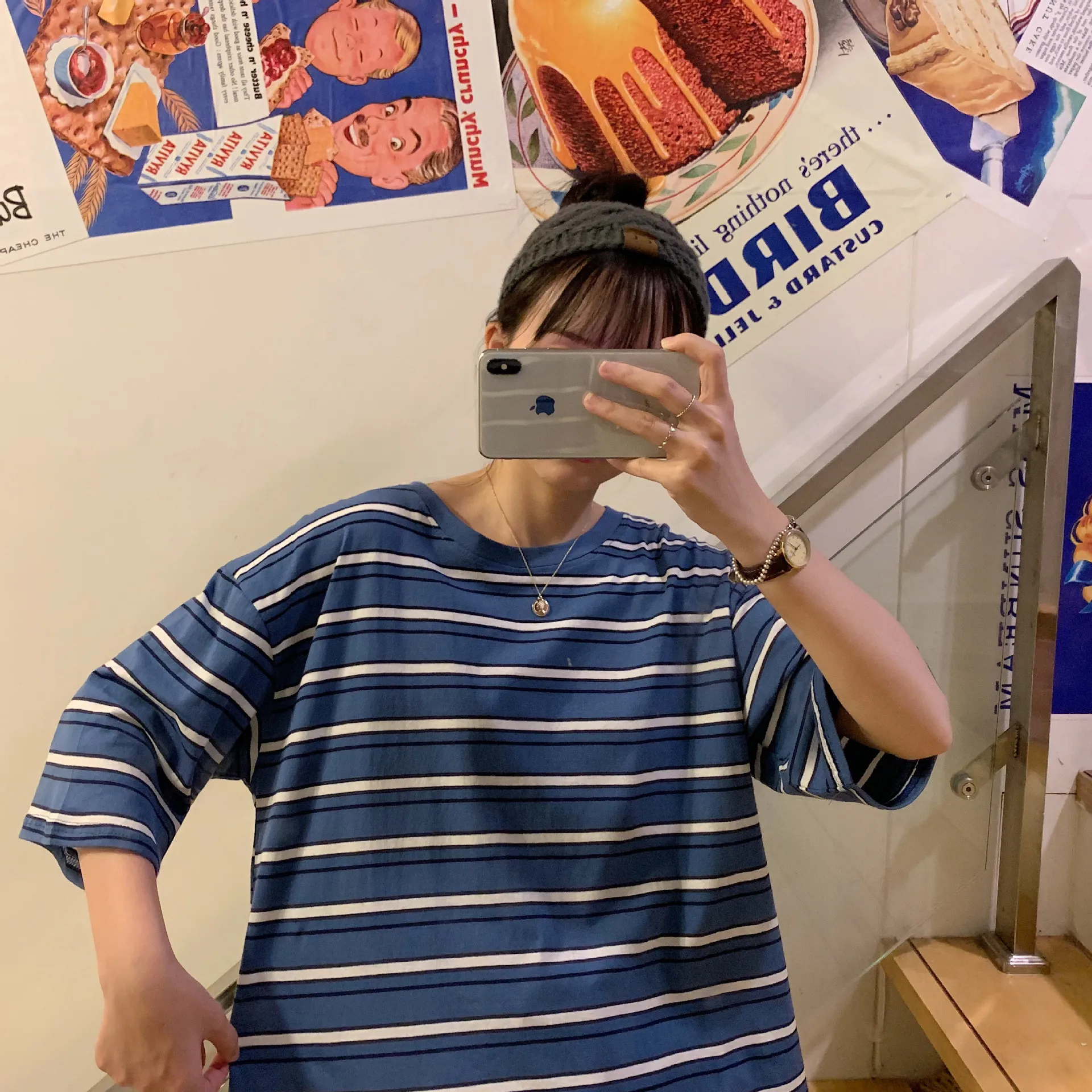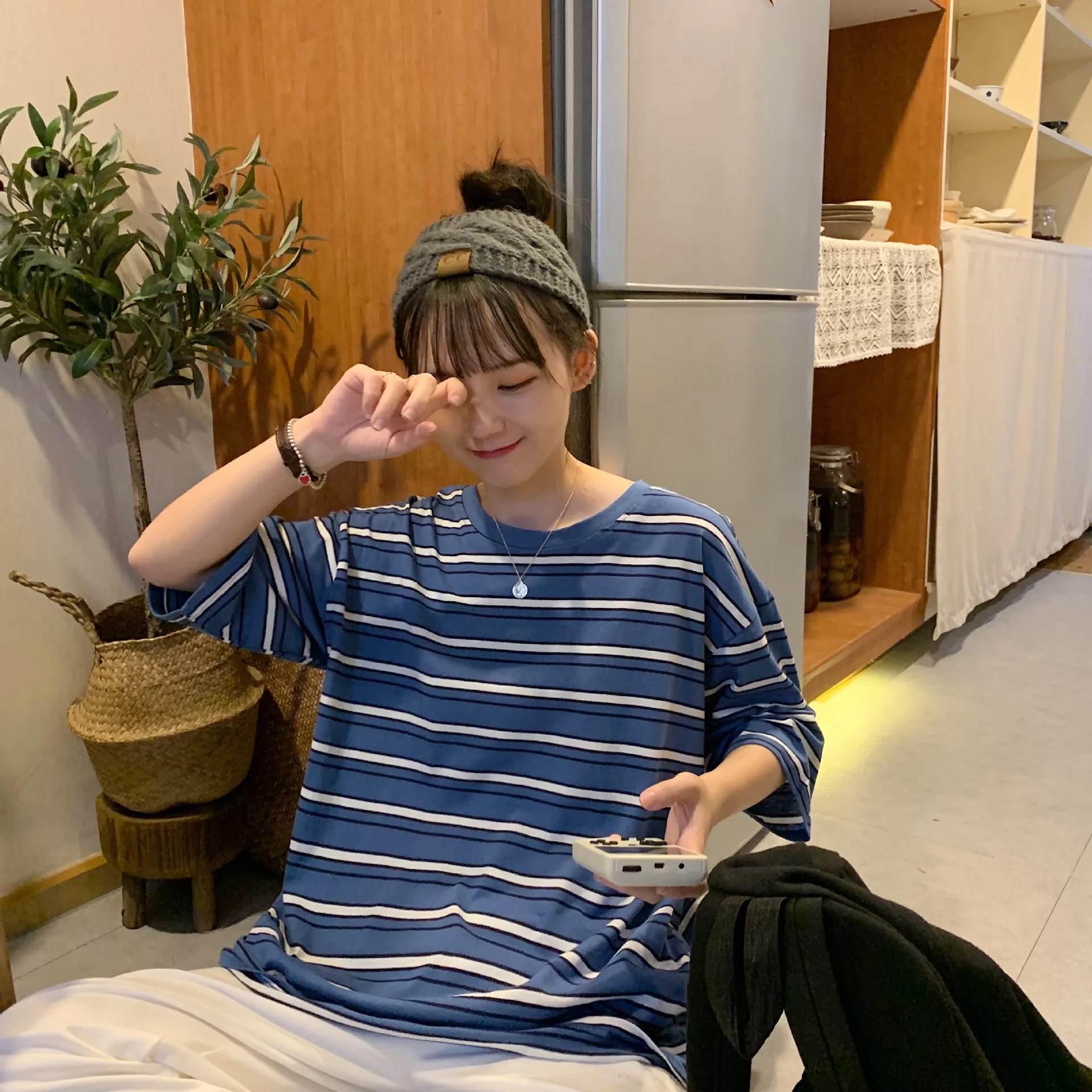 Photo Shoot Summer New Style Korean-style Mixed Colors Stripes Versatile Crew Neck Loose Short Slee